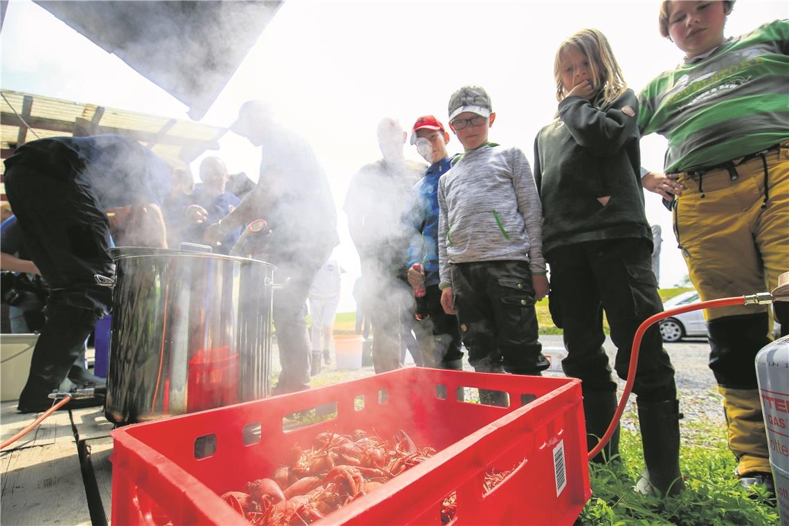 Packt man sie mit zwei Fingern hinter den Scheren, kann gar nichts passieren. Aber das Zugreifen kostet erst einmal etwas Überwindung. Manche Krebse haben nur eine große Schere, die zweite ist klein und sieht verkümmert aus. Die wurde beim Kampf verloren und wächst nun nach, ist die Erklärung. Je mehr Krebse gefangen werden, desto eifriger werden die Kinder. Insgesamt gute zwei Stunden wird gefangen und langweilig war es den Jungfischern ganz sicher nicht.