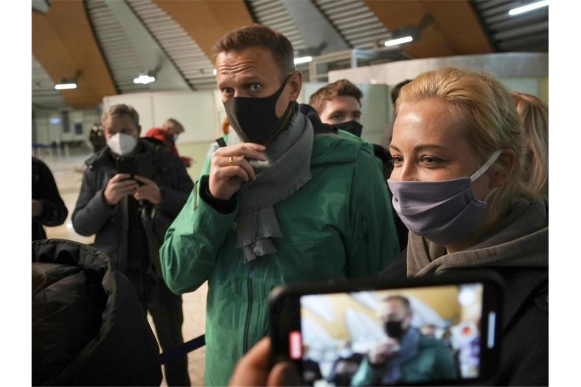 An der Passkontrolle ist Kremlkritiker Alexej Nawalny (M) - hier mit seiner Frau Julia - abgeführt worden. Foto: Mstyslav Chernov/AP/dpa