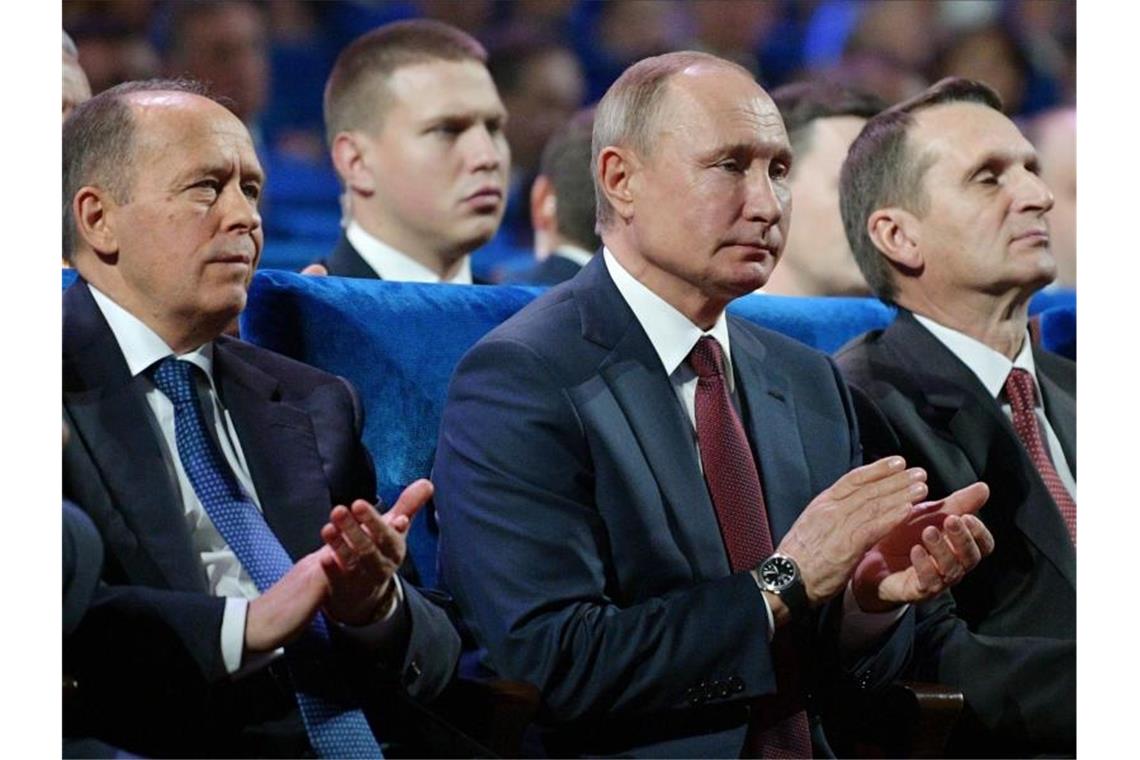 Alexander Bortnikow (v.l.n.r.), Leiter des russischen Inlandsgeheimdienstes FSB, Präsident Wladimir Putin und Sergei Naryschkin, Leiter des russichen Auslandsgeheimdienstes SWR. Foto: Alexei Nikolsky/Sputnik/Kremlin/AP/dpa