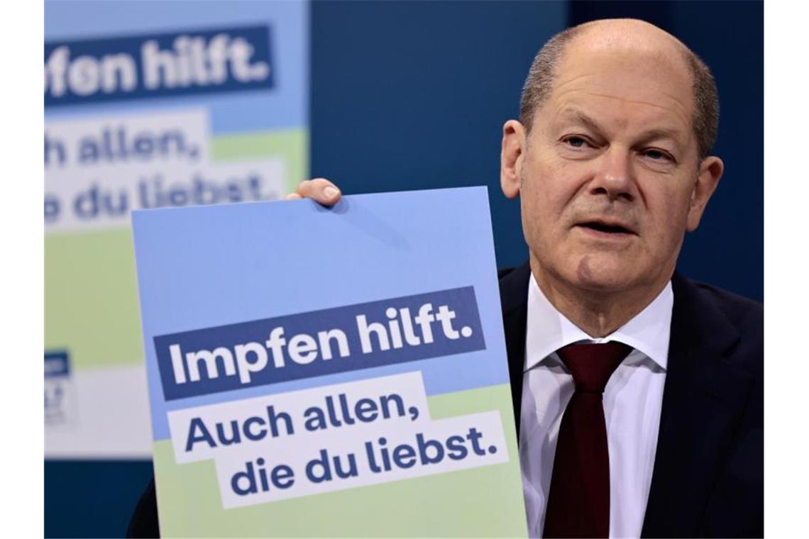 Bundeskanzler Olaf Scholz präsentiert ein Plakat aus der neuen Impfkampagne. Foto: Hannibal Hanschke/POOL AP/dpa