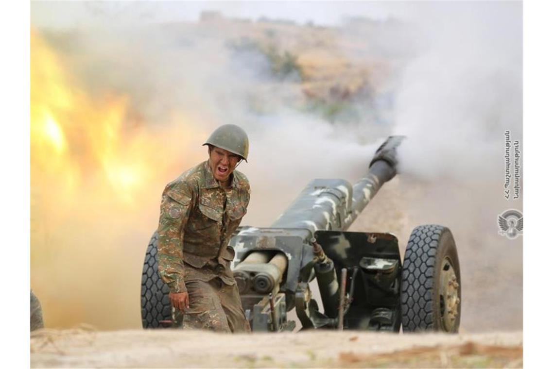 Ein armenischer Soldaten feuerte eine Kanone an. Die Zusammenstöße zwischen armenischen und aserbaidschanischen Streitkräften in der umstrittenen Region Berg-Karabach eskalieren weiter. Das Foto stammt vom armenischen Verteidigungsministerium. Foto: -/Armenian Defense Ministry/AP/dpa