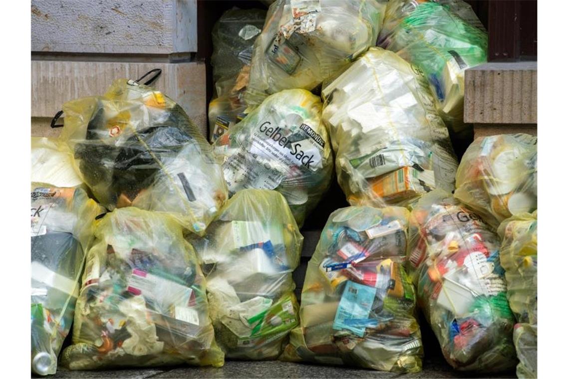 Mehrere gelbe Säcke auf einem Fußweg vor einem Haus in Hamburg. Foto: Robert Michael/dpa-Zentralbild/dpa