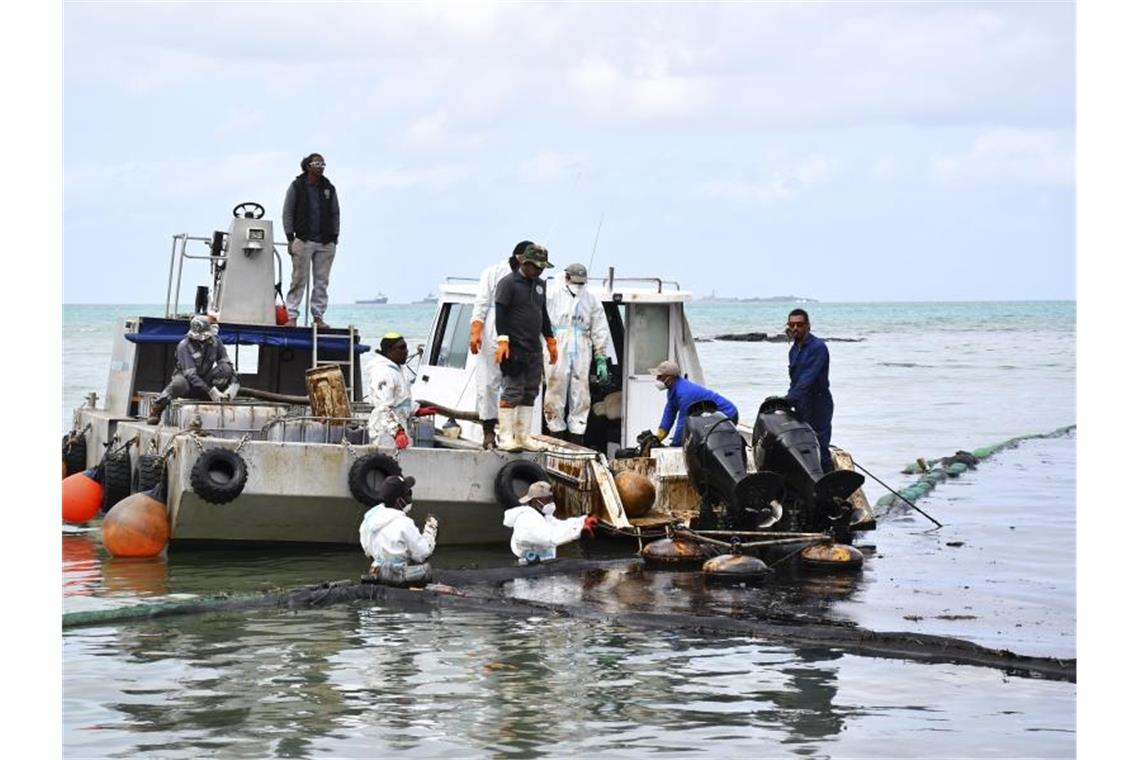 Arbeiter versuchen die Ausbreitung des Ölteppichs zu verhindern. Ein Frachter war zuvor auf Grund gelaufen. Foto: Ajai Daby/XinHua/dpa