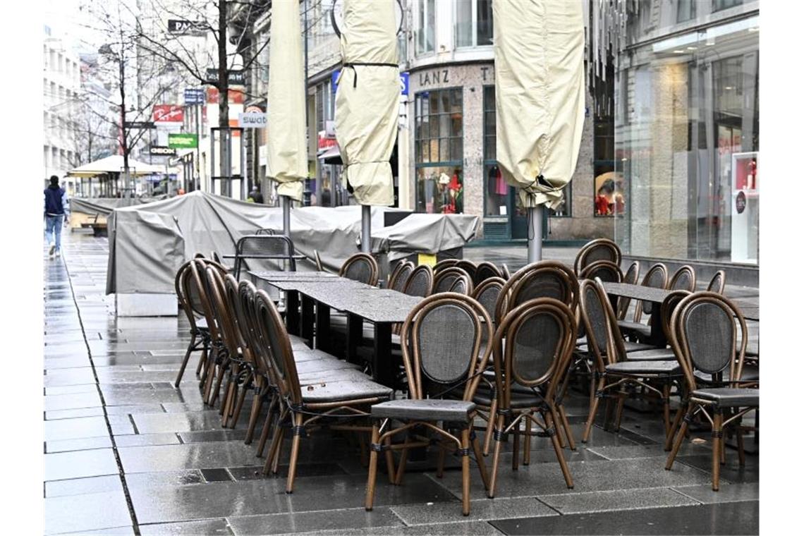 Zusammengestellte Tische und Stühle stehen in einer Fußgängerzone Wiens. (Archivbild). Foto: Hans Punz/APA/dpa