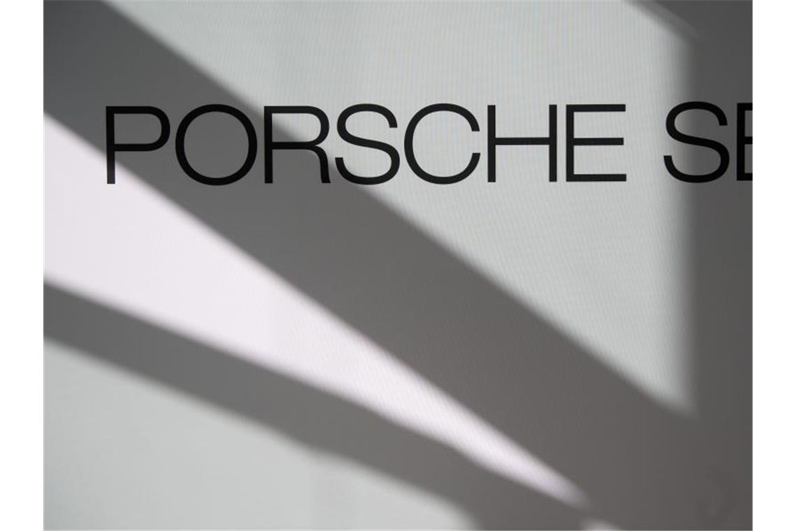 Logo und Schriftzug der Porsche SE sind bei der Bilanzpressekonferenz an einer Stellwand zu sehen. Foto: Marijan Murat/dpa