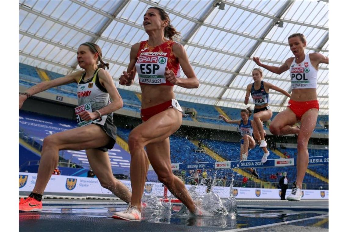 Elena Burkard (l-r) aus Deutschland, Irene Sanchez-Escribano aus Spanien, Martina Merlo aus Italien, Claire Palou aus Frankreich und Alicja Konieczek aus Polen in Aktion. Foto: Andrzej Grygiel/PAP/dpa/Archivbild