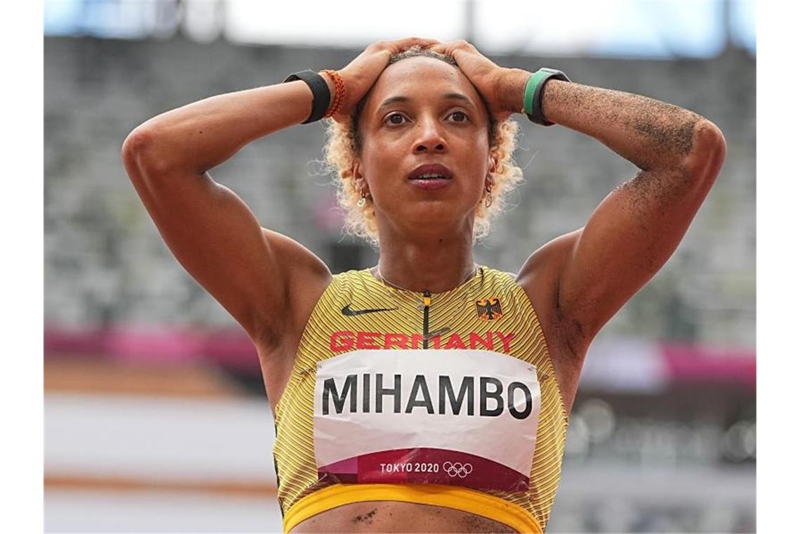 Malaika Mihambo, Weitspringerin aus Deutschland, hält sich den Kopf. Foto: Michael Kappeler/dpa/Archivbild
