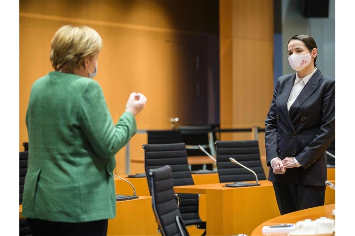 Das Volk in ihrem Land erwarte etwa Unterstützung für unabhängige Medien und zivile Organisationen, um die Folgen der Krise zu überwinden, teilte sie im Anschluss an das Treffen mit Bundeskanzlerin Angela Merkel (CDU) in Berlin über den Nachrichtenkanal Telegram mit. Merkel selbst äußerte sich nach dem Gespräch nicht. Auch in der Sitzung der Unionsfraktion sagte sie nach Teilnehmerangaben nichts zu den Ergebnissen der Unterredung. Derweil verließ der deutsche Botschafter in Belarus, Manfred Huterer, das Land vorübergehend.