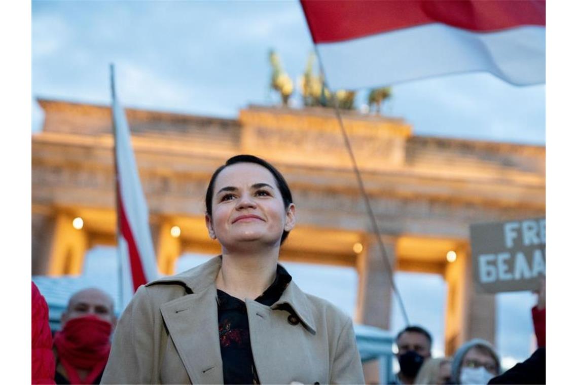 Am Montag hatte sie zu Beginn ihres Besuchs in Berlin auch gleich einen Mauerbesuch gemacht. Ganz ergriffen sei sie gewesen, als sie ein Mauerstück auf dem Potsdamer Platz sah - bemalt in den belarussischen Farben weiß und rot mit Parolen der Demonstranten, sagte sie. Wenig später jubelten ihr Dutzende belarussische Protestierende vor dem Brandenburger Tor bei einer Kundgebung zu. „Macht weiter. Wir wissen nicht, wie lange dieser Kampf noch andauern wird, aber wir brauchen eure Hilfe“, rief sie den Anwesenden zu.