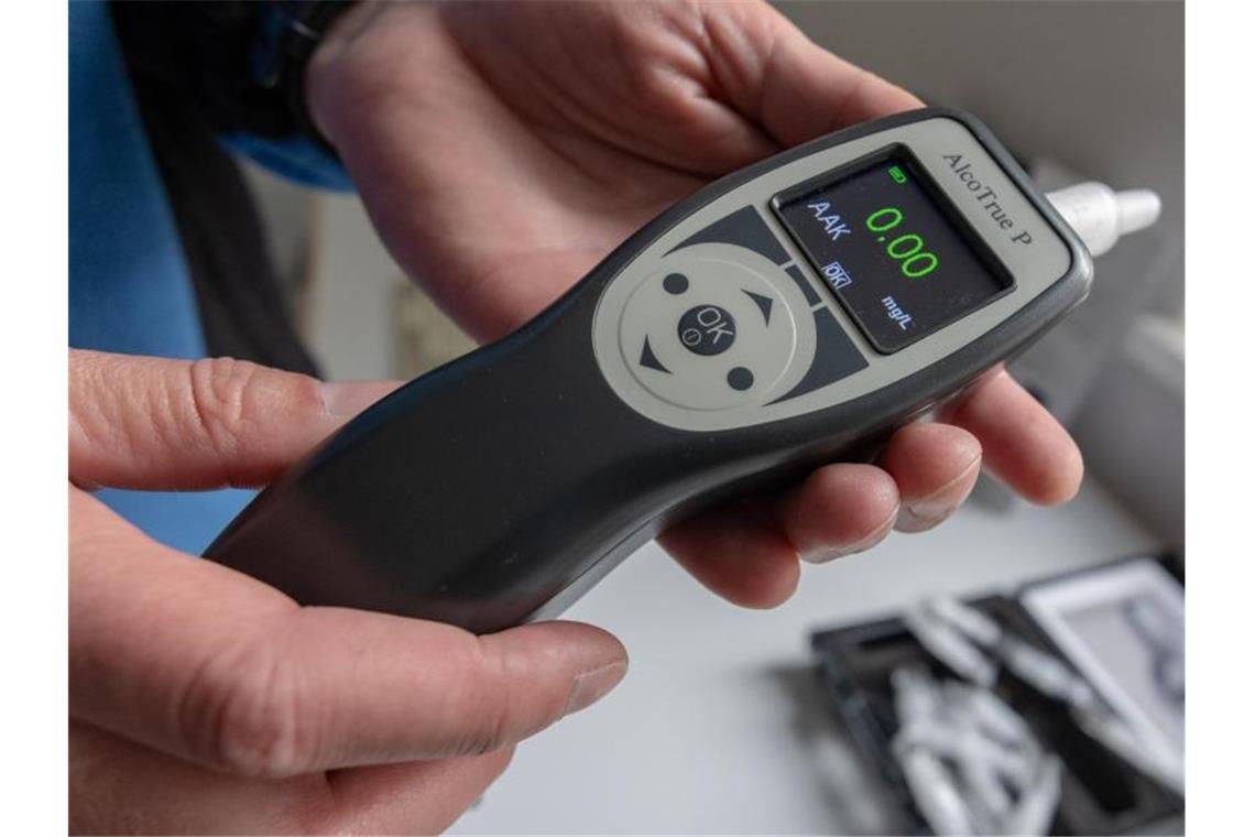 Eine Person hält ein Atemalkoholmessgerät in den Händen. Foto: Armin Weigel/dpa/Archivbild