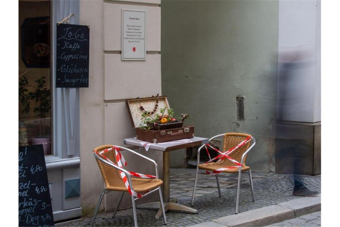Ein Mann geht an Stühlen eines Cafés vorbei, die mit Flatterband gesperrt wurden. In Passau dürfen die Menschen ihre Wohnung seit Samstag nur noch aus triftigem Grund verlassen. Foto: Lino Mirgeler/dpa