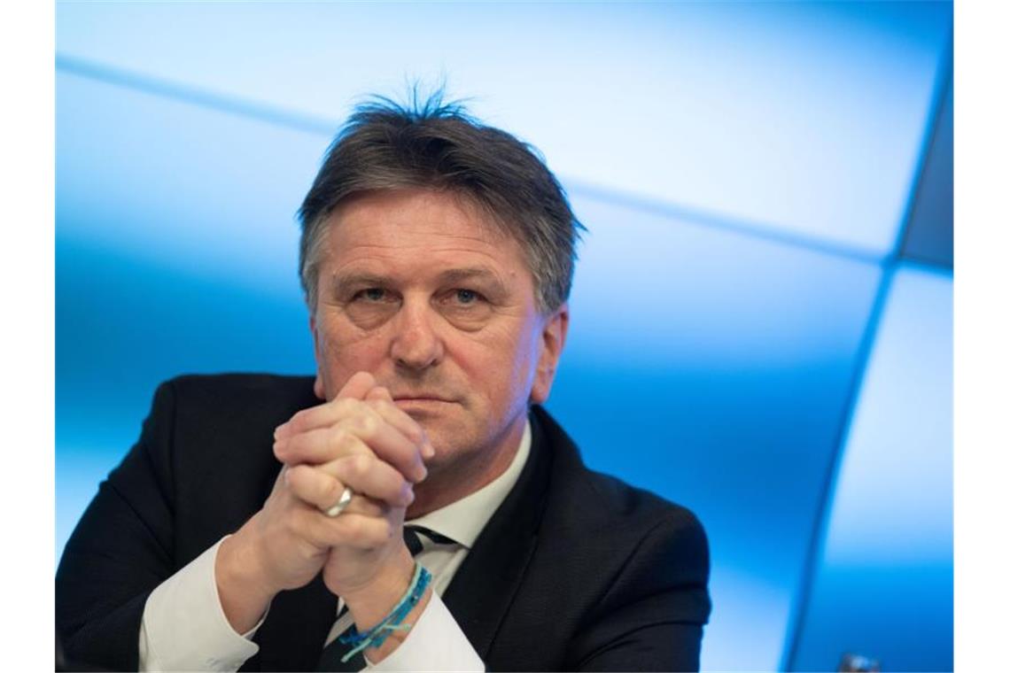 Manfred „Manne“ Lucha (Bündnis 90/Die Grünen, l), Sozialminister von Baden-Württemberg, vor der Presse. Foto: Marijan Murat/dpa/Archivbild