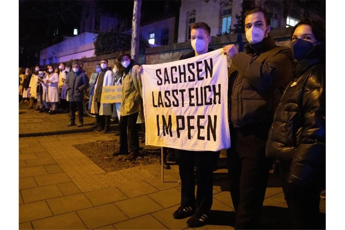 Gegendemonstranten riefen zum impfen auf. Foto: Sebastian Kahnert/dpa-Zentralbild/dpa