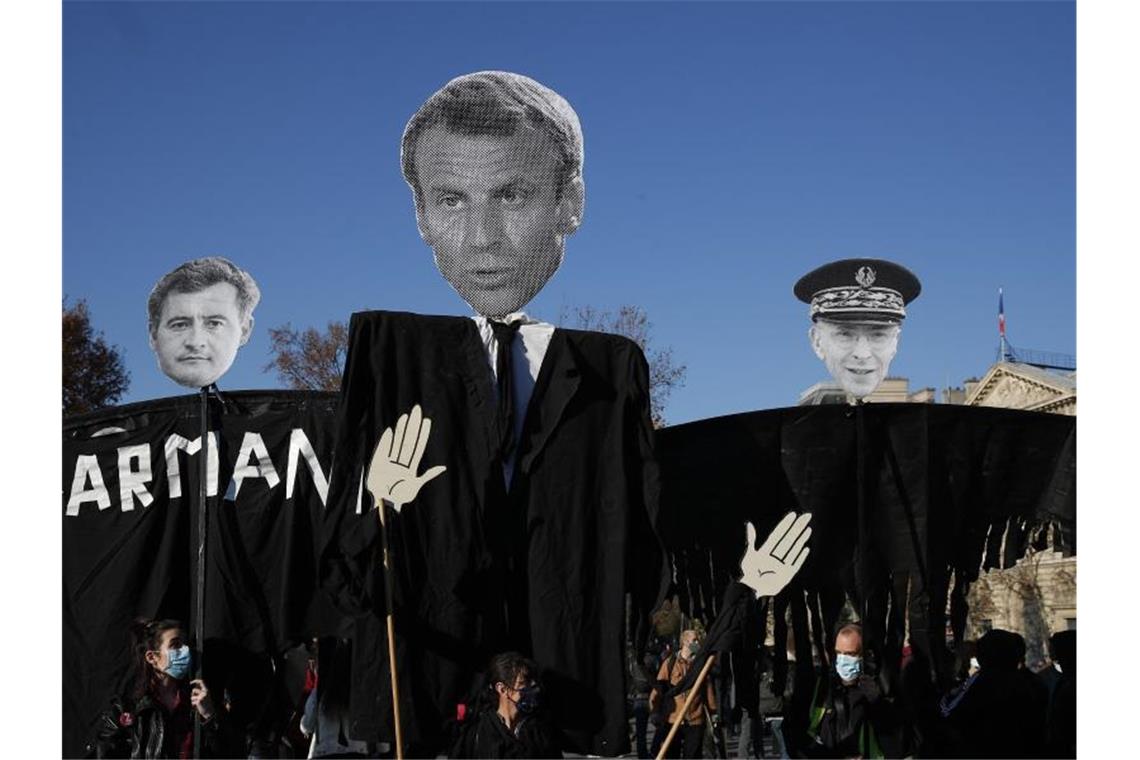 Die Abbilder des französischen Innenministers Darmanin (l-r), des französischen Präsidenten Macron und des Pariser Polizeipräfekten Lallement werden während einer Demonstration gegen ein neues Sicherheitsgesetz in die Höhe gehalten. Foto: Francois Mori/AP/dpa
