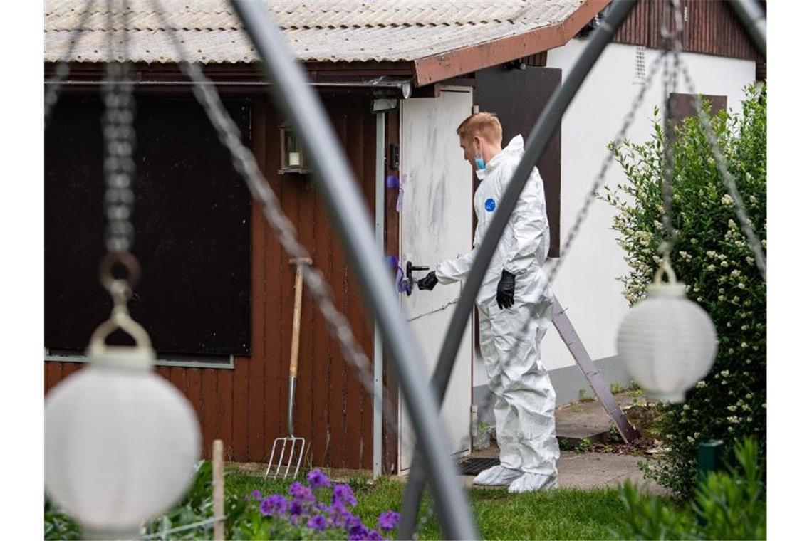 Spurensicherung an der Laube des vermutlichen Haupttäters in Münster. Foto: Guido Kirchner/dpa