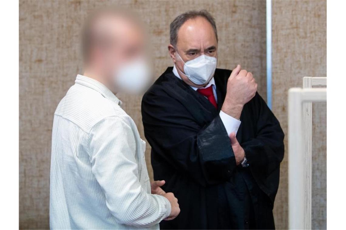 Der angeklagte Polizist (l) mit seinem Anwalt im Verhandlungssaal. Der Mann wurde zu einer Geldstrafe von 13.200 Euro verurteilt. Foto: Sven Hoppe/dpa