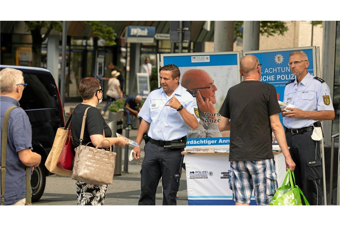 In Baden-Württemberg erbeuteten die Täter im Jahr 2018 allein mit der Masche „Falscher Polizeibeamter“ insgesamt 6,8 Millionen Euro, im Jahr 2019 waren es bereits über zehn Millionen Euro mit anhaltend steigender Tendenz. Auch im Zuständigkeitsbereich des Polizeipräsidiums Aalen waren eine Vielzahl von Anrufstraftaten – Versuche und vollendete Delikte – zu verzeichnen. In Backnang gab es im ersten Halbjahr 2020 sieben Schadensfälle in Sachen Enkeltrick. Die Masche mit den falschen Polizisten wurde hier mindestens 50-mal abgezogen, mindestens drei Schadensfälle, also für die Täter erfolgreiche Ausführungen, waren zu verbuchen. „Die Dunkelziffer dürfte allerdings noch deutlich höher sein“, unterstreichen die Beamten Gulde und Mejzlik. Um ältere Menschen vor derartigen Betrügern zu schützen, seien besonders die Angehörigen oder andere Vertrauenspersonen in der Pflicht. Die Polizei wird ebenfalls weiter ihr Bestes geben, die Zahl dieser Fälle zu senken. Im vergangenen Jahr haben die Aalener Beamten die Prävention vorwiegend in Vorträgen praktiziert. Dieses Jahr stehen die Infostände auf den Wochenmärkten auf dem Plan. Auf dem Backnanger Wochenmarkt wird die Polizei am 2. September wieder mit dem Stand vertreten sein, wo man sich auch mit entsprechendem Infomaterial eindecken kann.