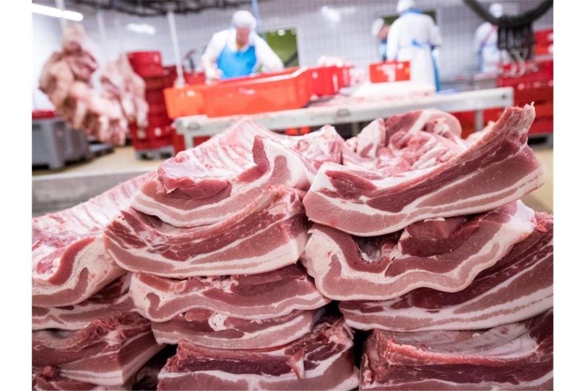 Rippen und Bauchfleisch vom Schwein werden in einem Zerlegebetrieb auf dem Gelände des Fleischgroßmarkts (FGH) verarbeitet. Foto: Christian Charisius/dpa