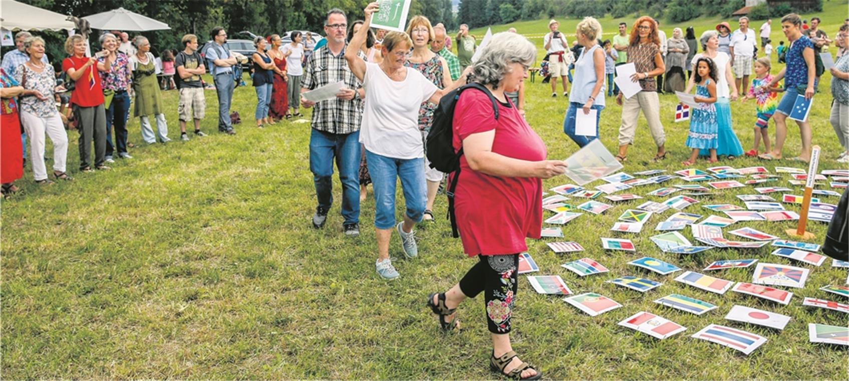 Aktion „Alle Länder sind gleich“: Besucher legen in einem großen Kreis Fotos der Flaggen der 193 UNO-Mitgliedsstaaten nieder. Foto: A. Becher