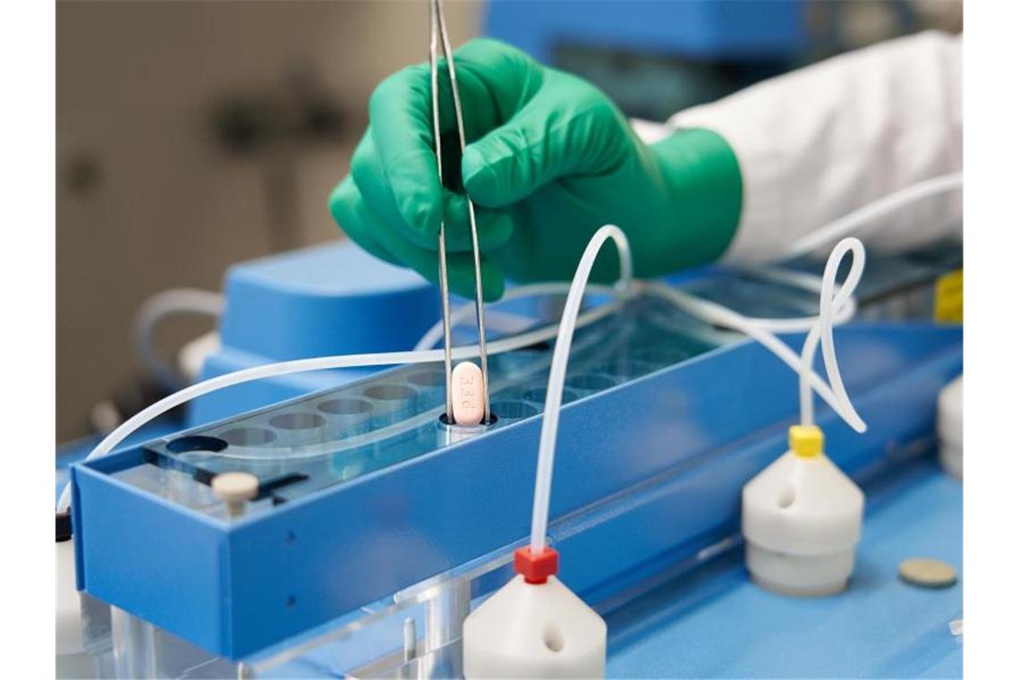 Ein Mitarbeiter von Pfizer hält eine Paxlovid-Tablette mit einer Zange. Foto: Pfizer/dpa