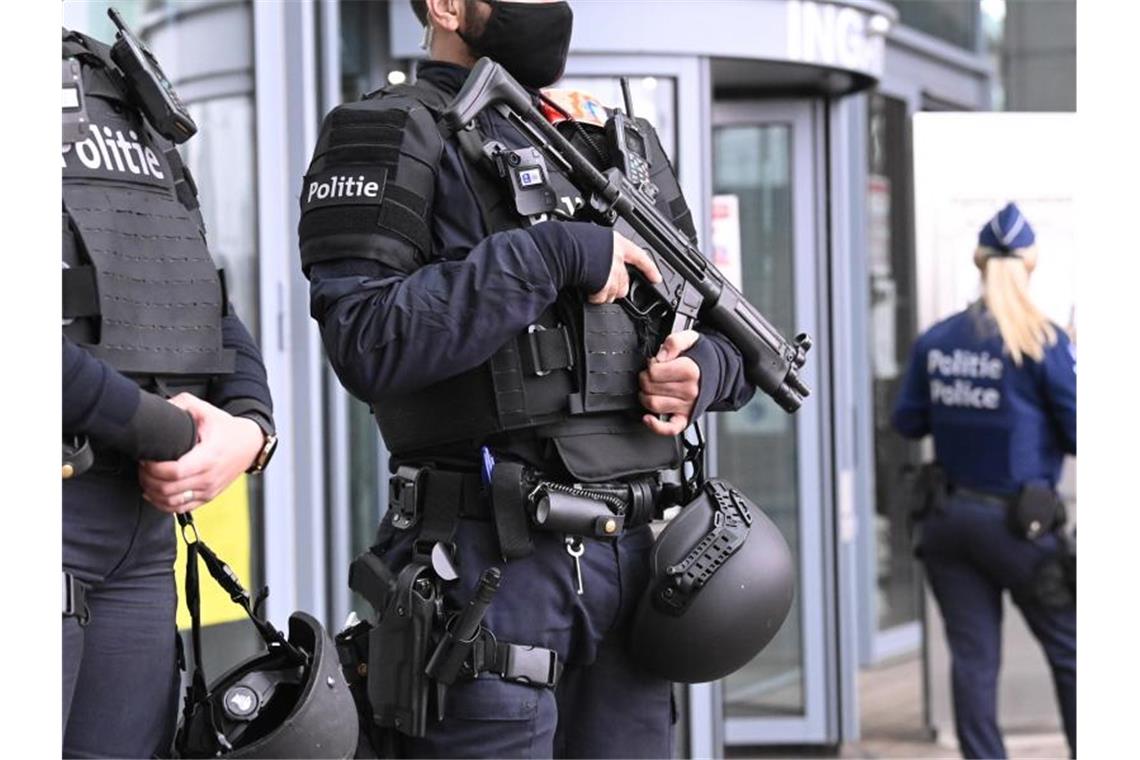 Polizeibeamte stehen bewaffnet vor Prozessbeginn vor dem Eingang des Gerichts. Foto: Dirk Waem/BELGA/dpa