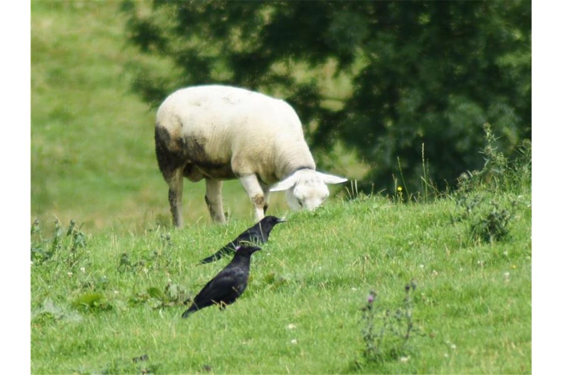 Raben stehen auf einer Weide vor einem Schaf. Foto: picture alliance / dpa