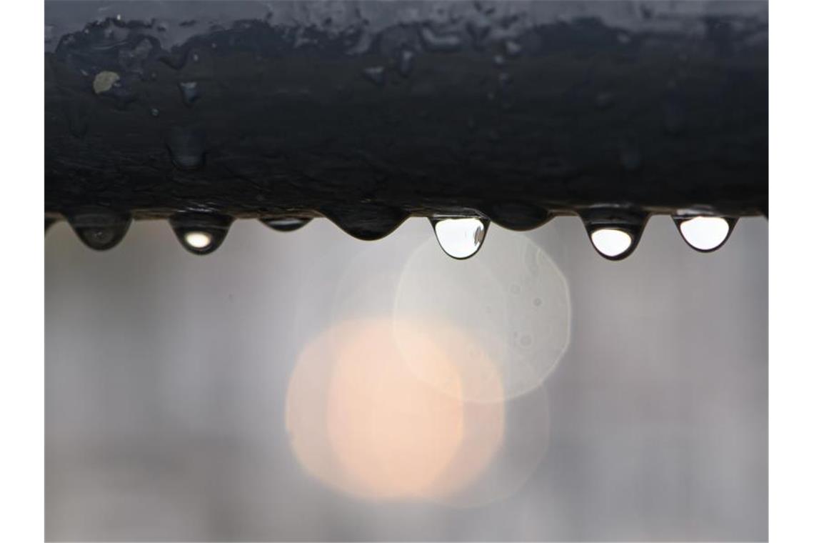 Regentropfen hängen an einem Geländer. Foto: Robert Michael/dpa-Zentralbild/dpa/Symbolbild