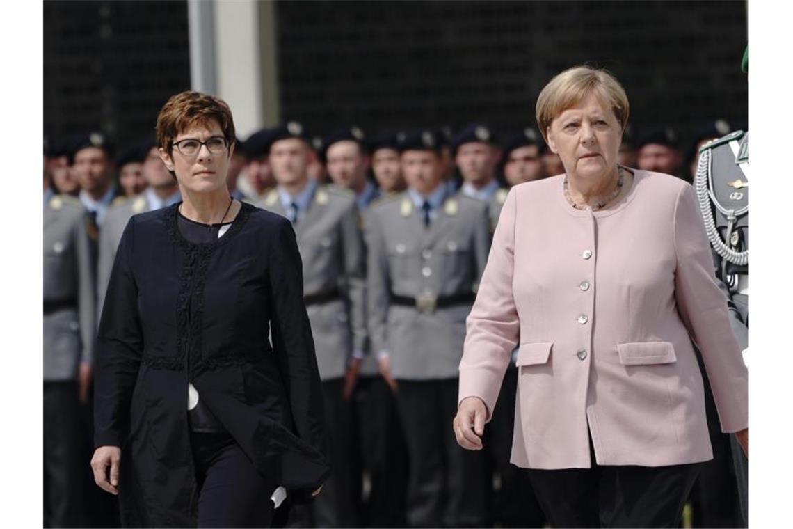 Verteidiungsministerin Annegret Kramp-Karrenbauer und Bundeskanzlerin Angela Merkel bei der Feierstunde in Berlin. Foto: Michael Kappeler