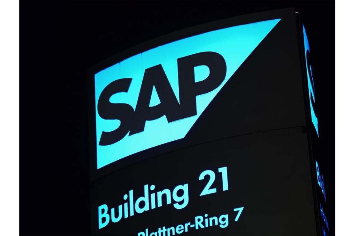 Ein von innen beleuchtetes Logo des Softwarekonzerns SAP steht vor einem Firmengebäude. Foto: Uwe Anspach/dpa/Symbolbild