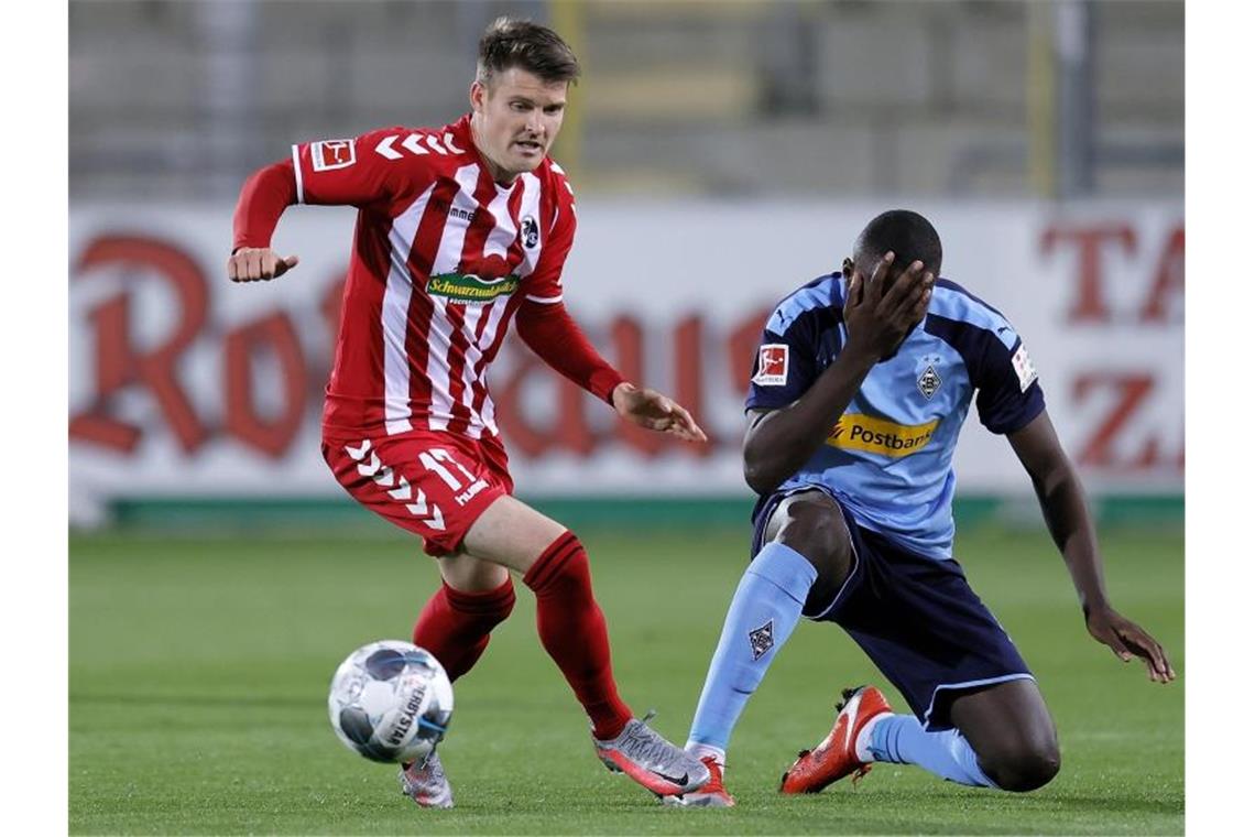 Freiburgs Lukas Kübler (l) und Mönchengladbachs Marcus Thuram in Aktion. Foto: Ronald Wittek/epa/Pool/dpa/Archivbild