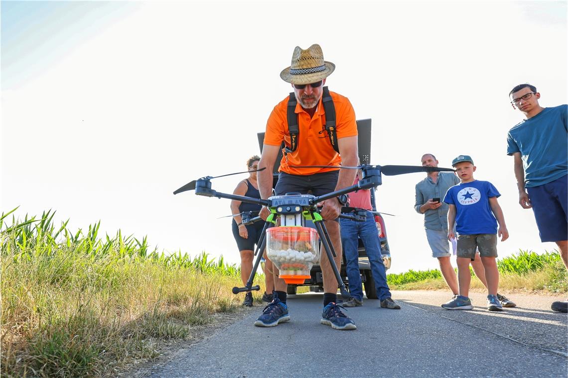 Für die Befliegung setzt Mike Stather aus Diehlheim eine selbst umgebaute Drohne ein, aus deren durchsichtigem Unterbau 100 kleine Zellulosekugeln pro Hektar Ackerfläche abgeworfen werden. Fotos: Alexander Becher