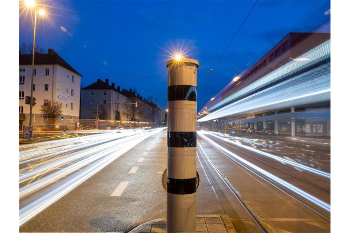 Eine Blitzsäule (PoliScan red+speed) mit kombinierter Überwachung von Rotlicht und Geschwindigkeit steht an einer Ampelkreuzung in der Nürnberger Innenstadt. Foto: Daniel Karmann/dpa