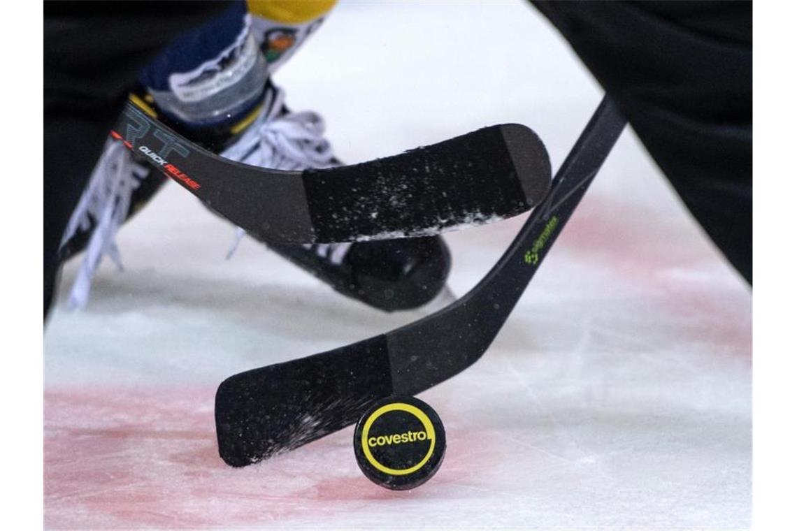 Mehrere Eishockeyspieler kämpfen um den Puck. Foto: Bernd Thissen/dpa/Symbolbild
