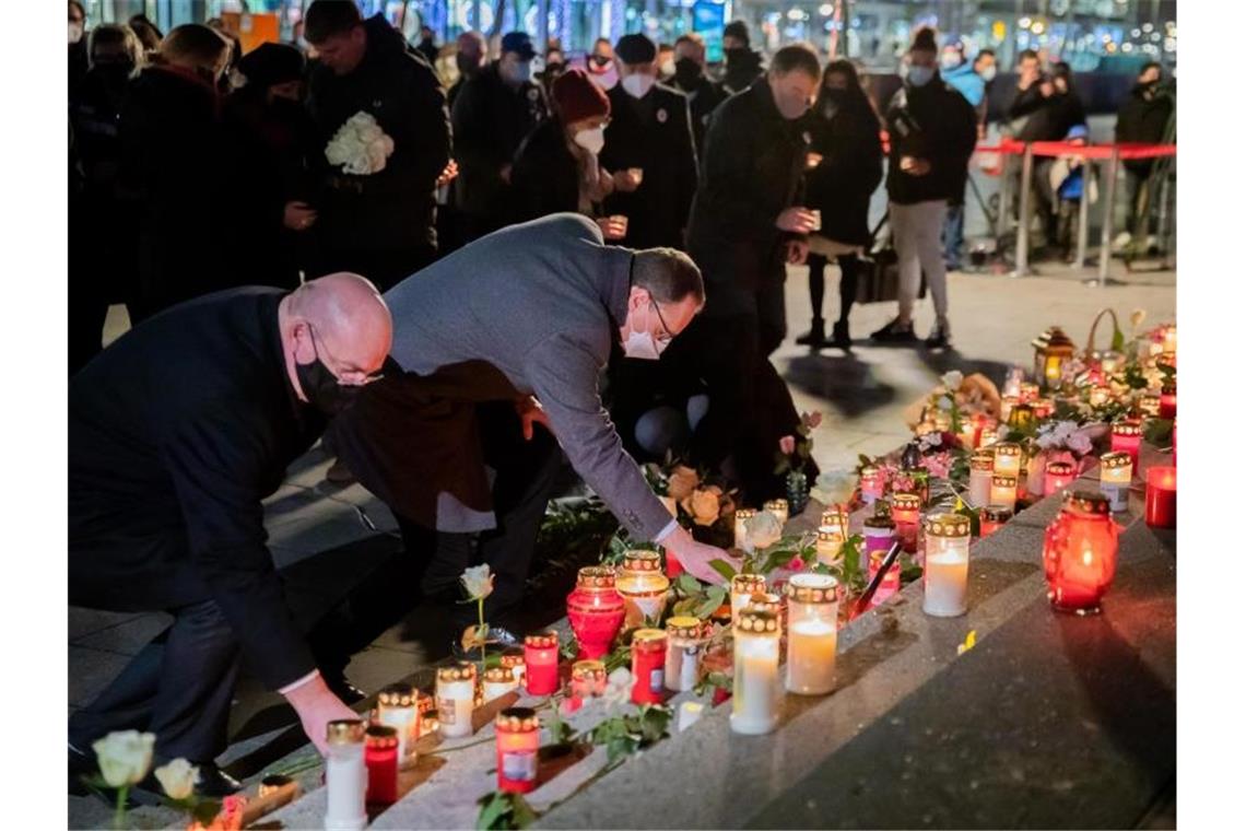 Michael Müller (SPD, M), Regierender Bürgermeister von Berlin, und Edgar Franke (SPD), Opferbeauftragter der Bundesregierung, legen bei einer Gedenkfeier am vierten Jahrestag des islamistischen Anschlags auf den Weihnachtsmarkt am Breitscheidplatz Kerzen nieder. Foto: Christoph Soeder/dpa