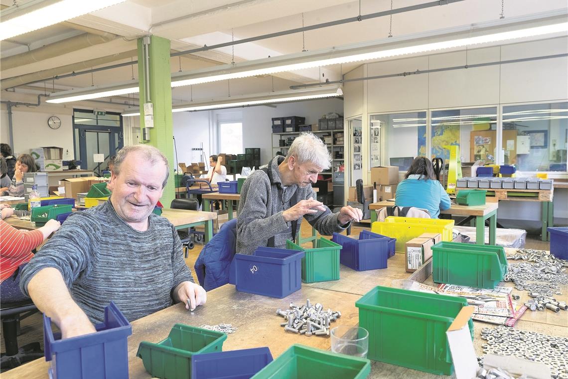 Blick in die Werkstatträume: Peter Bosch und Thomas Maurer (von links) an ihrem Montagearbeitsplatz. Insgesamt sind in der Murrhardter Einrichtung rund 100 Menschen beschäftigt. Fotos: J. Fiedler