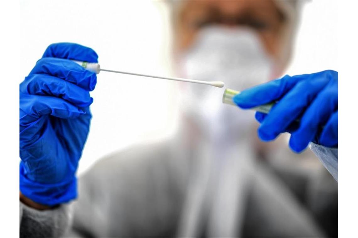 Ein Abstrichstäbchen wird in einer ambulanten Corona-Test-Einrichtung gehalten. Foto: Britta Pedersen/dpa-Zentralbild/dpa/Symbolbild