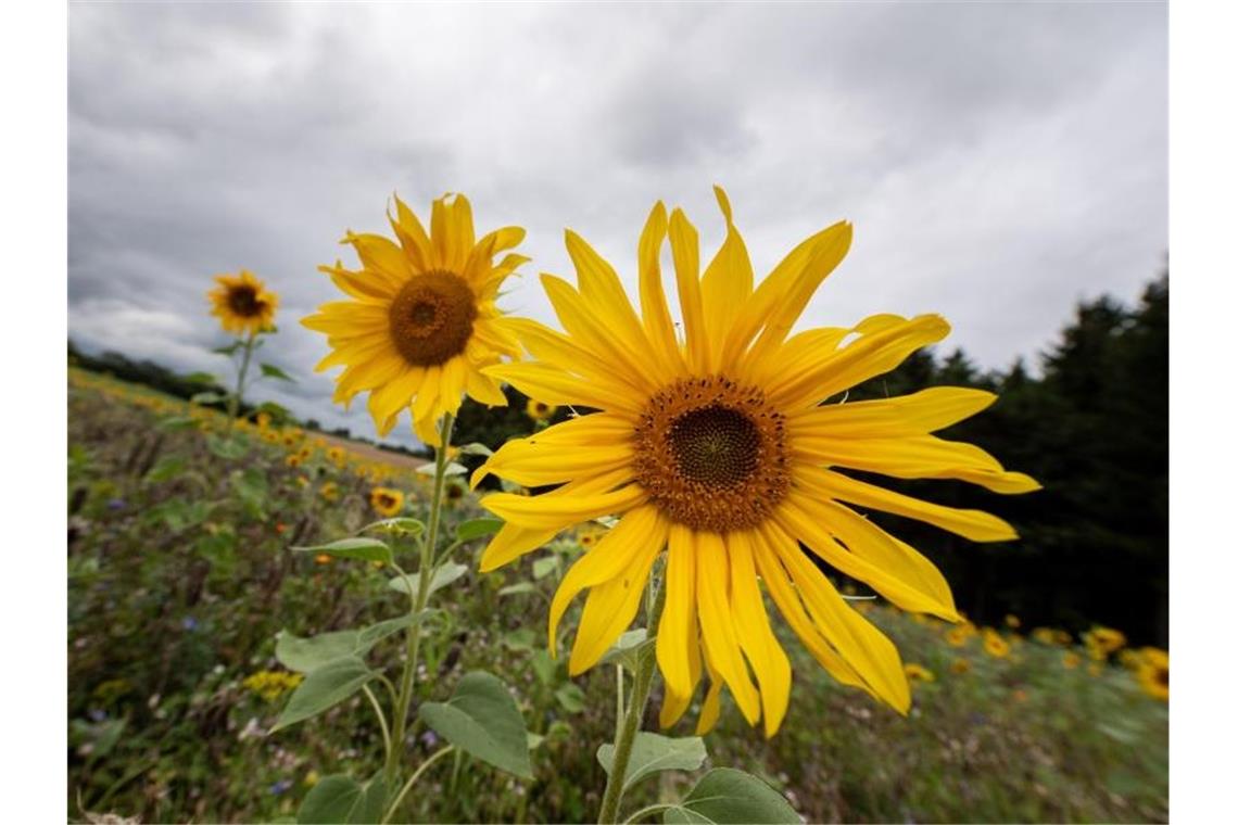 Hinter Sonnenblumen türmen sich am Himmel dunkle Wolken auf. Foto: Fabian Sommer/Archivbild