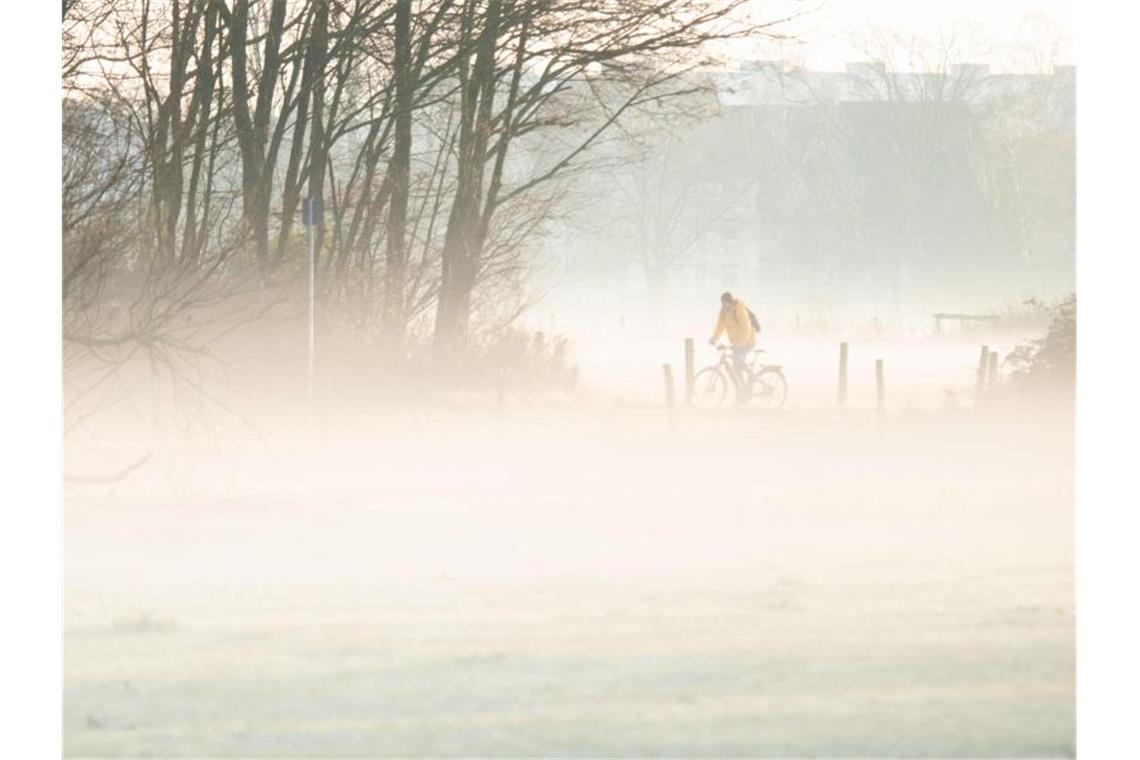 Ein Mann radelt durch den morgendlichen Nebel. Foto: Julian Stratenschulte/dpa/Archivbild