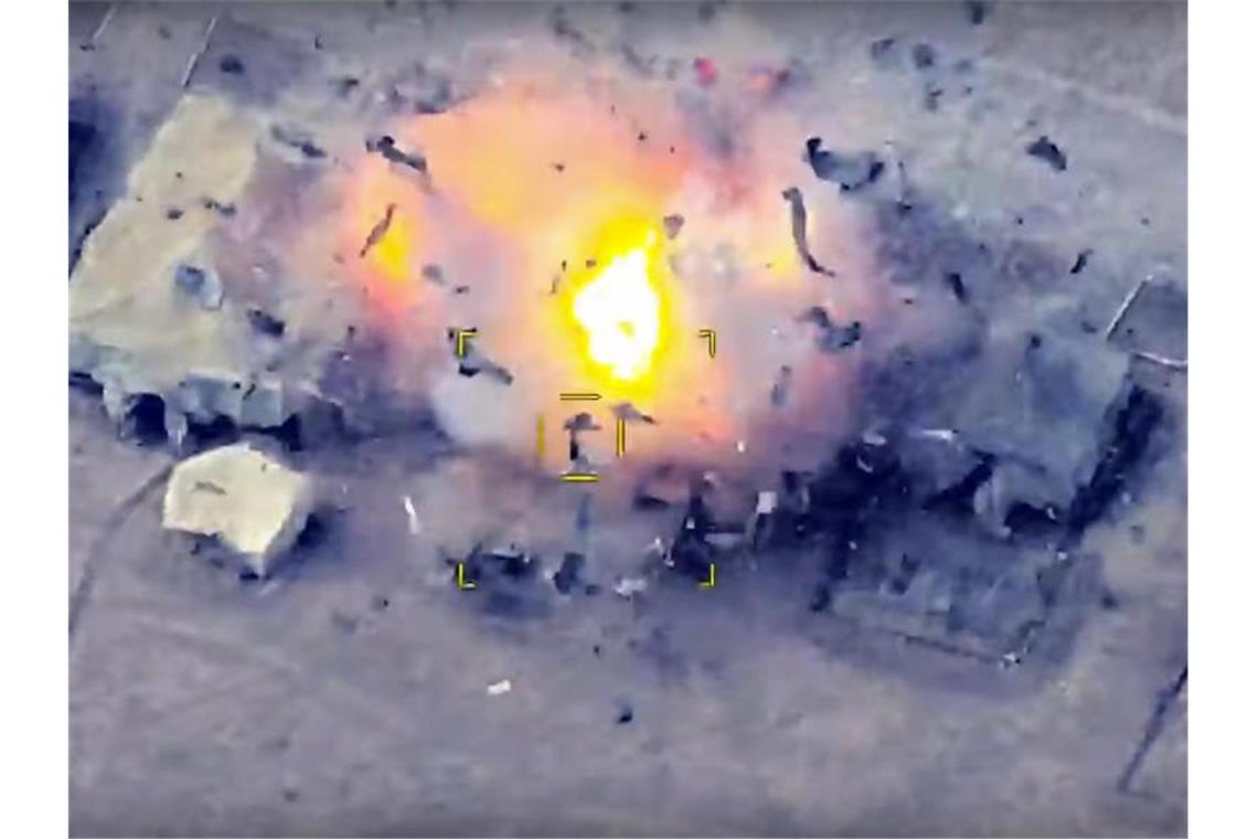 Das Videostandbild, das vom aserbaidschanischen Verteidigungsministerium zur Verfügung gestellt wurde, zeigt den Angriff auf ein Lager der armenischen Armee in Berg-Karabach. Foto: Uncredited/Azerbaijan's Defense Ministry/AP/dpa