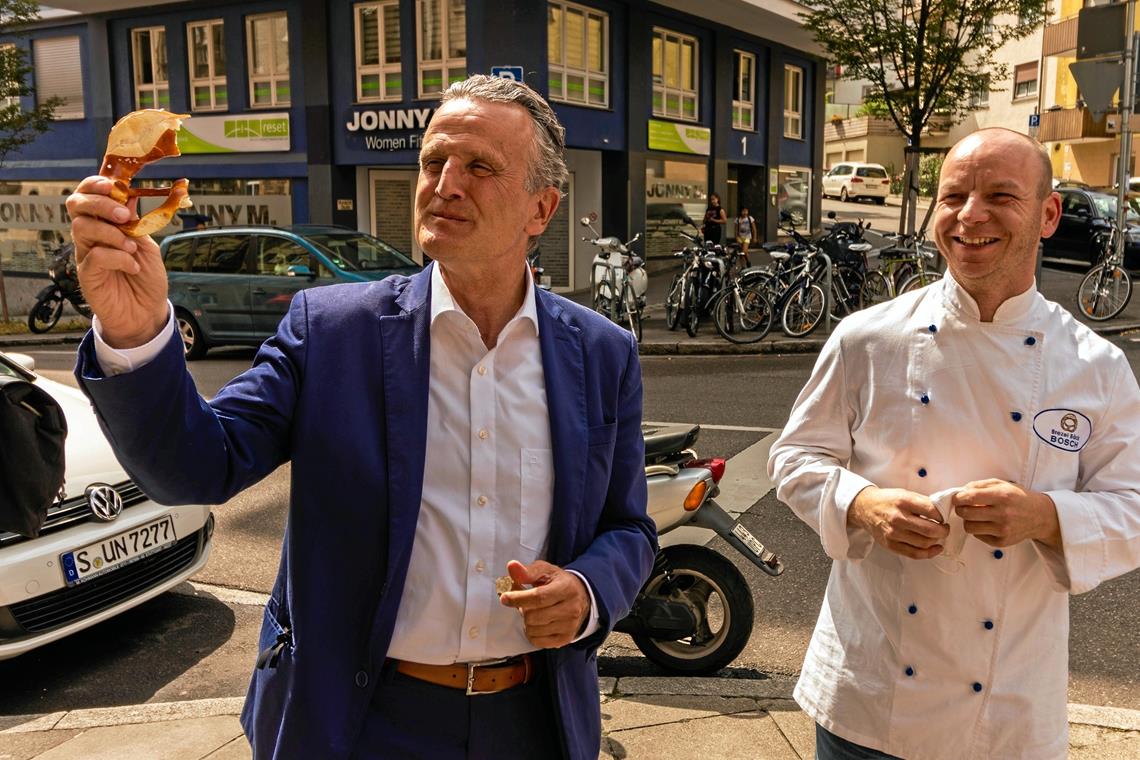 Ohne Krawatte auf Zuhörtour: Frank Nopper besucht im Wahlkampf zurzeit alle 23 Stuttgarter Stadtbezirke. Hier testet er im Stuttgarter Westen die Brezeln von Bäckermeister Justin Bosch. Foto: J. Kurwan