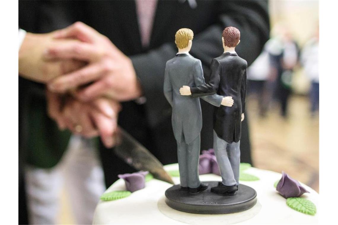 Ehe für Alle: Zwei Männer schneiden nach ihrer Eheschließung eine Hochzeitstorte an. Foto: Ina Fassbender/dpa