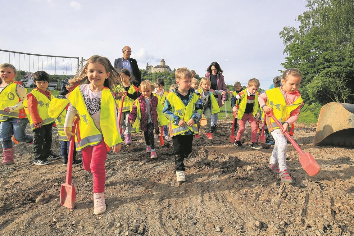 OPPENWEILER (log). „Stein auf Stein, das Häuschen soll bald fertig sein“ sangen die Kinder des Kindergartens Burgblick – ganz so schnell gehe es dann doch nicht, fügte Bürgermeister Bernhard Bühler schmunzelnd an. In den Sommerferien 2020 sollen die Kinder einziehen können – das sieht die Bedarfsplanung der Betreuungseinrichtungen vor. Nun wurde der erste Spatenstich für den Neubau des Kindergartens Burgblick in Oppenweiler gesetzt. Das Bestandsgebäude aus den 70er-Jahren habe mit den Anforderungen an einen modernen Kindergarten nicht mehr mithalten können, so Bühler. „Eine Sanierung wurde als unwirtschaftlich eingeschätzt.“ Im September hatte der Gemeinderat den Abriss des Gebäudes formal beschlossen, der Abbruch erfolgte im Februar. Nun geht es mit den Erdarbeiten los. Architekt Nico Mast erklärte den Gästen seinen Entwurf des Neubaus. Herzstück dessen ist eine große Markthalle, die sich über zwei Geschosse öffnet. „Alle Wege führen zentral hindurch“, so Mast. Somit sei dort stets Betrieb. Vier Kindergartengruppen sollen hier Einzug finden. Man liege im Zeitplan, jedoch nicht im erhofften Kostenrahmen: Bei einer Schätzung von 3,3 Millionen Euro für die Baukosten sei man angelangt, so Bühler.