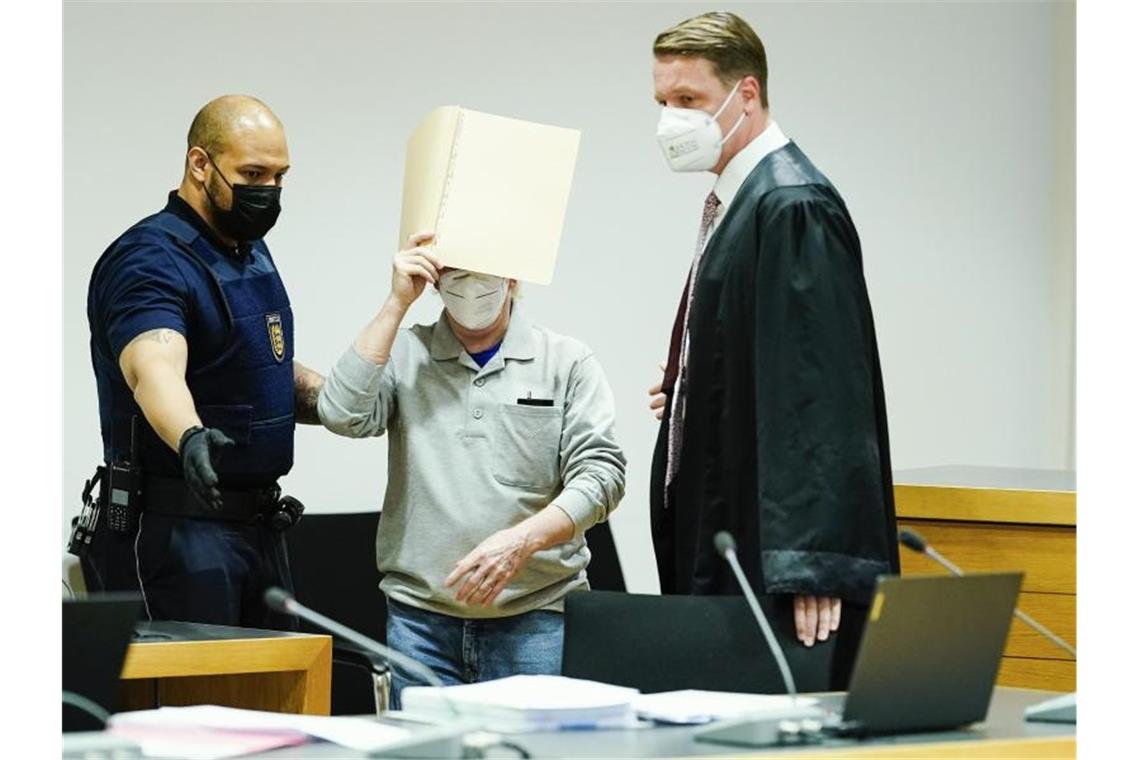 Der Angeklagte (M) kommt zu seinem Anwalt Steffen Lindberg (r) in den Gerichtssaal des Landgerichts. Foto: Uwe Anspach/dpa pool/dpa