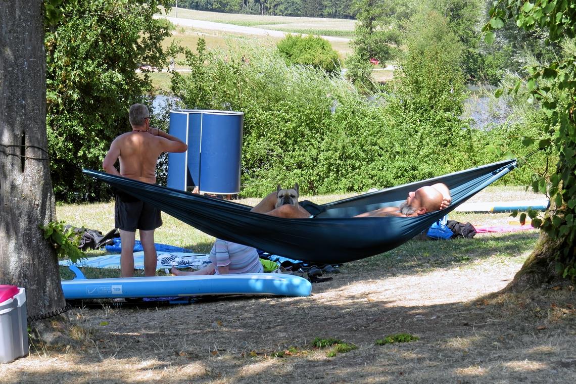 Der rund vier Hektar große Aichstrutsee bei Welzheim ist umgeben von Liegewiesen. Er dient gleichzeitig als Hochwasserrückhaltebecken der Lein. Am Rande finden sich auch schattige Plätzchen und am gegenüberliegenden Ufer ist ein Nichtschwimmerbereich eingerichtet. Fotos: Christine Schick