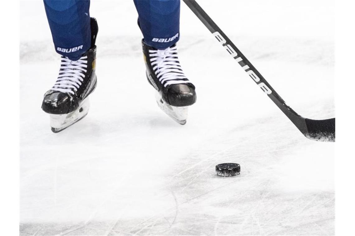 Ein Eishockeyspieler spielt den Puck. Foto: Matthias Balk/dpa/Symbolbild
