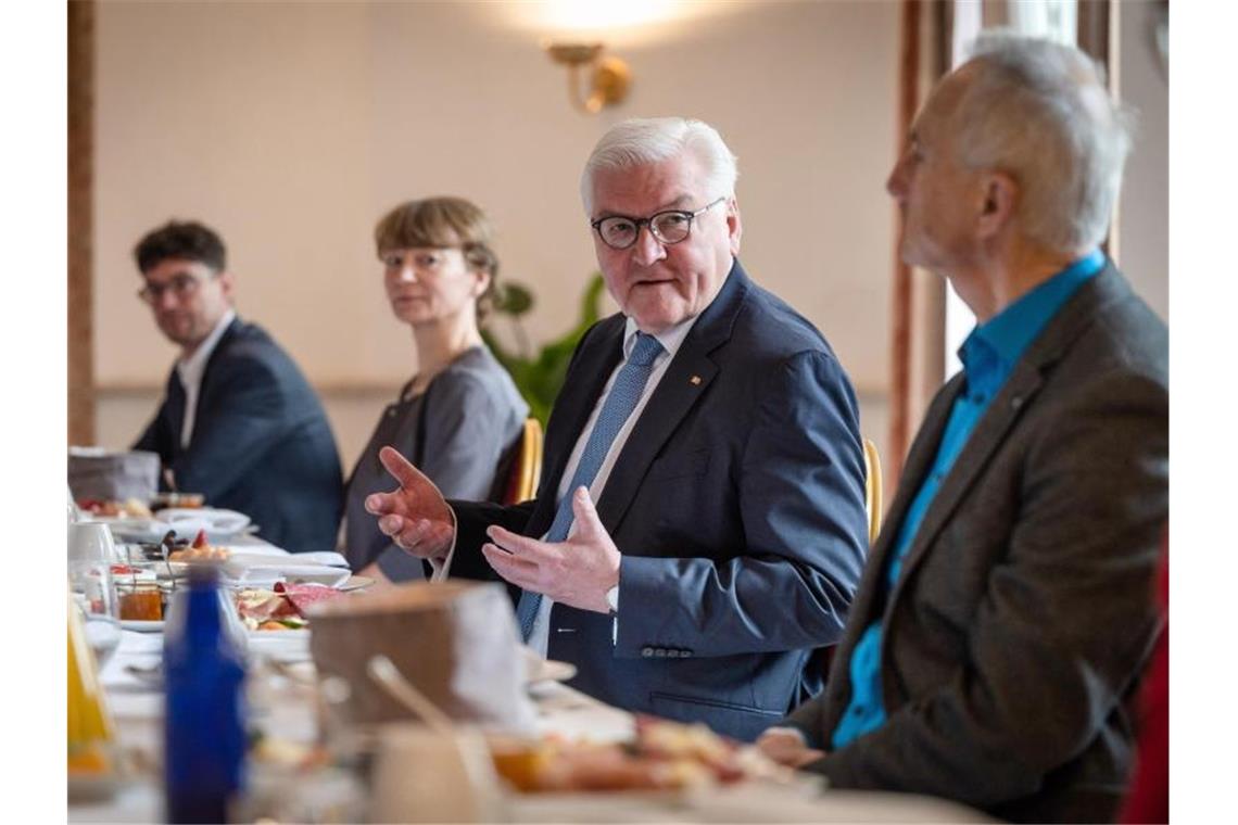 Bundespräsident Frank-Walter Steinmeier spricht in Altenburg mit engagierten Bürgerinnen und Bürgern. Foto: Kristin Schmidt/dpa
