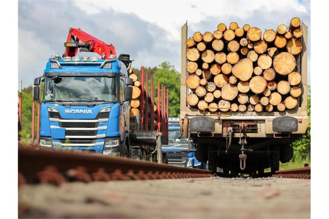 Baumstämme liegen auf einem Güterzug im Erzgebirge. Foto: Jan Woitas/dpa-Zentralbild/dpa