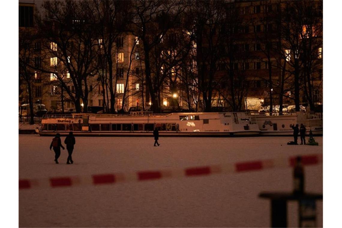 Trotz Absperrung trauen sich am Abend einige Menschen auf das Eis auf dem Berliner Landwehrkanal. Foto: Annette Riedl/dpa