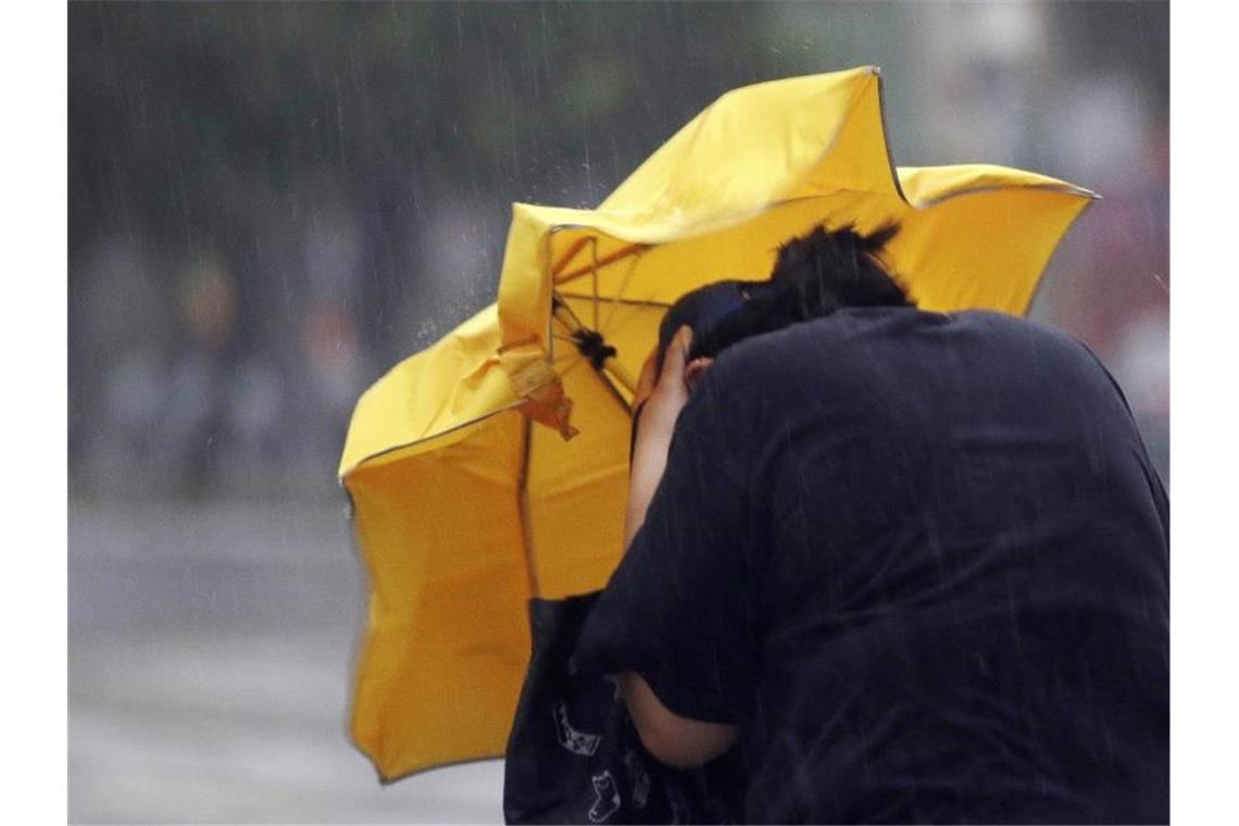 Eine Frau kämpft mir einem Regenschirm gegen Windböen. Foto: Chiang Ying-Ying/AP/dpa/Archivbild