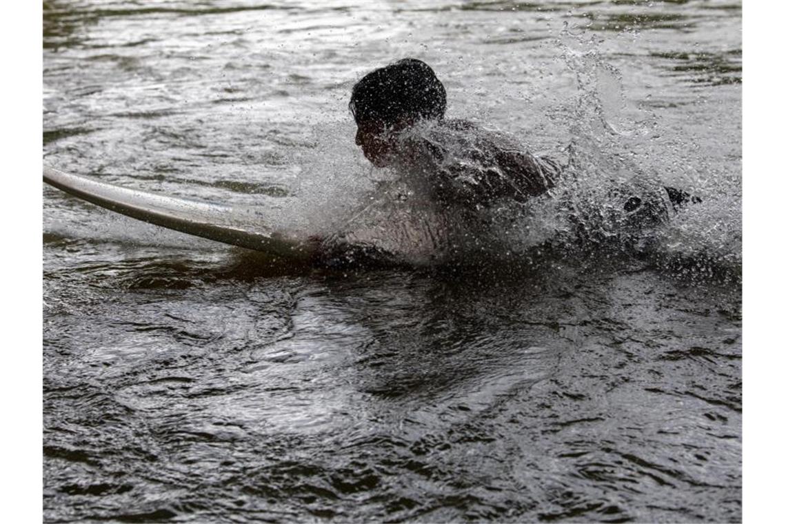 Ein Surfer springt bei Waiblingen mit seinem Board in die Iller zwischen Bayern und Baden-Württemberg. Foto: Stefan Puchner/dpa